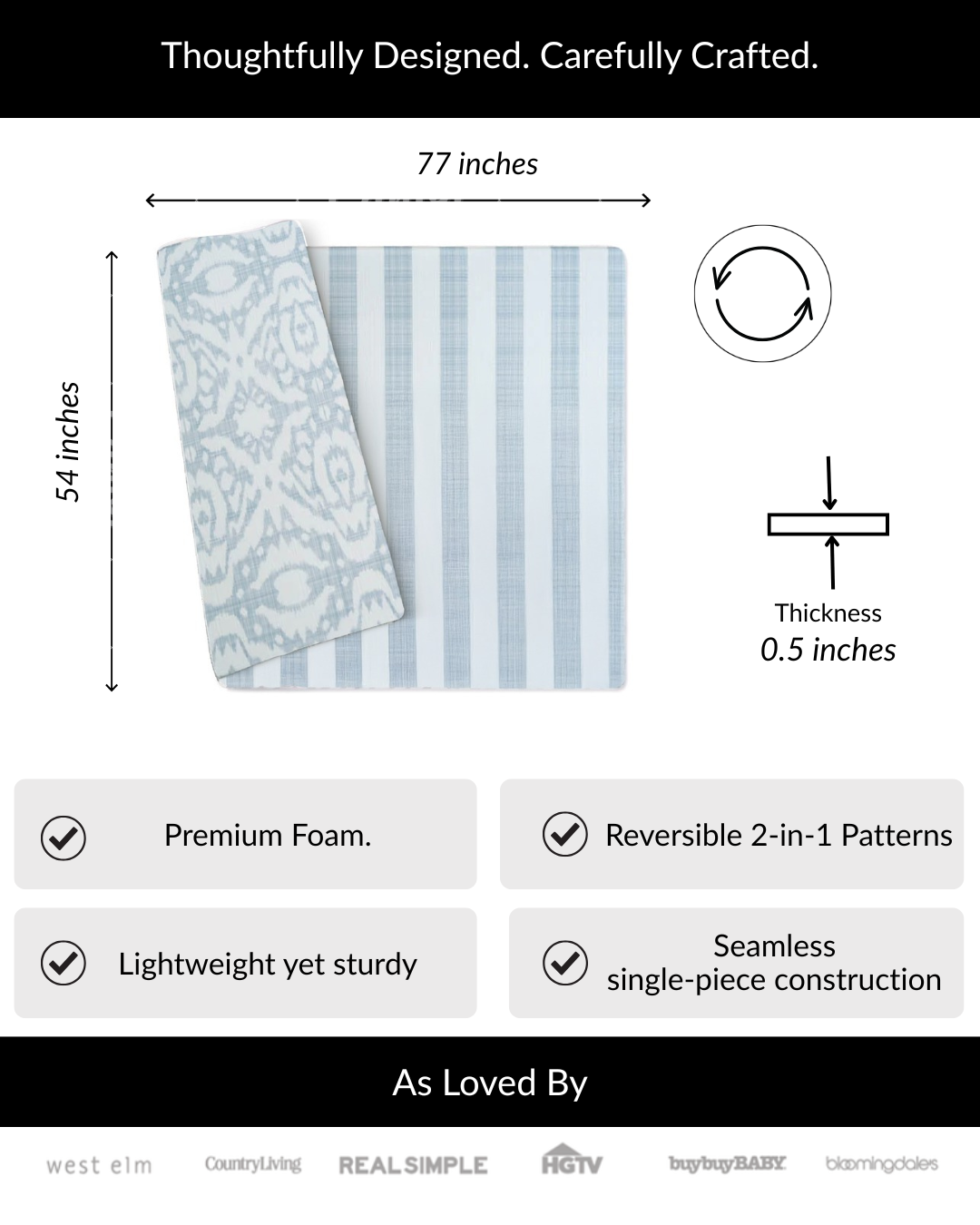 • Large, one-piece design – 77" x 54" (6.5' x 4.5')