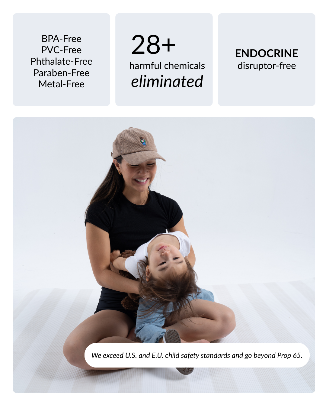 • Health: Free from harmful chemicals, including BPA, PVC, phthalates, latex, parabens, and endocrine disruptors