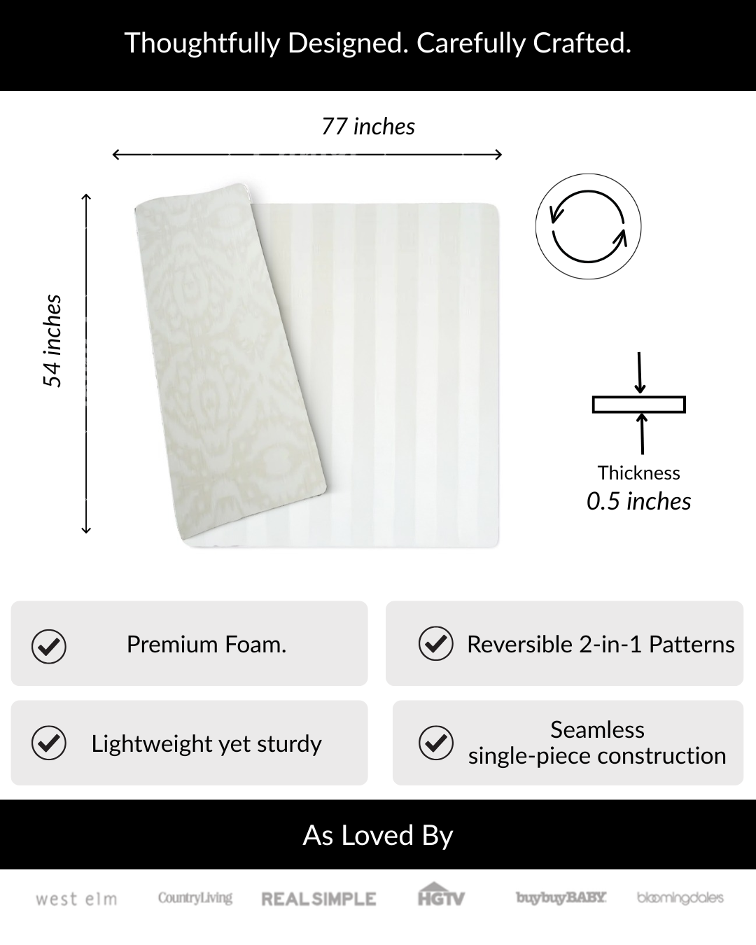 • Large, one-piece design – 77" x 54" (6.5' x 4.5')